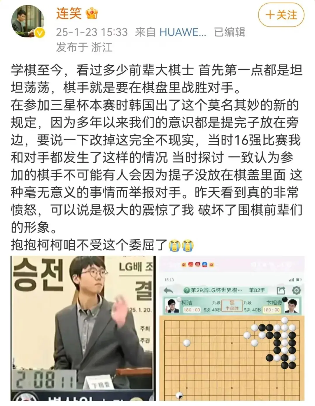 1月23日下午,第29届LG杯世界围棋棋王战决赛第三盘在韩国进行。柯洁在遭遇了昨日“提子判负”风波之后,今日再次因为一颗子未放入棋盒被裁判介入封盘。韩国裁判现场宣布:因为柯洁提子没有放到棋盒盖,正常判罚两目,在协商后柯洁提出重赛未被裁判组采纳,而柯洁也不接受判罚,选择退赛!卞相壹夺冠。潮新闻·钱江晚报综合自@聂卫平、@连笑、@唐韦星、钱江晚报此前报道、九派新闻等